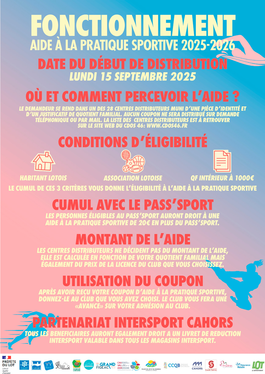 Aide financière sous réserve d’éligibilité et dans la limite des coupons disponibles. Retrouvez la liste des centres distributeurs sur le site du CDOS 46 : www.cdos46.fr