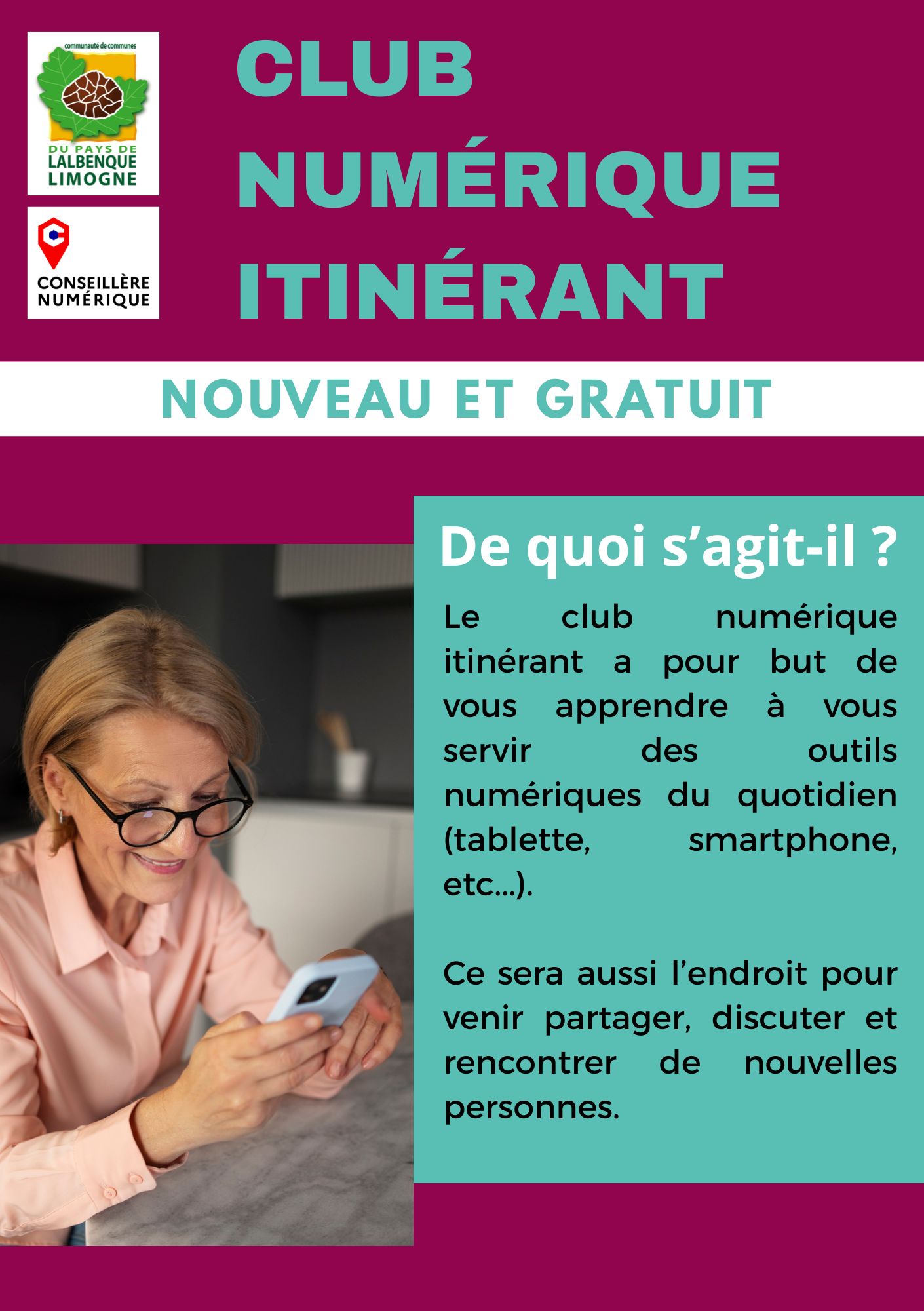 Le club est un moment de convivialité et d’entraide où chacune et chacun partage ses expériences et ses problématiques sur les outils numériques. Il se mettra en place sur les communes qui regrouperont 6 à 10 personnes. Il se réunira régulièrement à un rythme établi avec les participants. Pas de programme défini : le contenu de la séance répondra aux besoins, questions, centres d’intérêts des personnes.