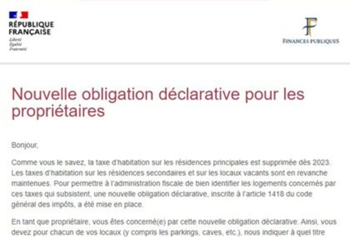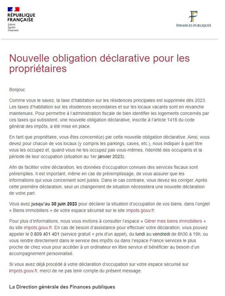 Bonjour, Comme vous le savez, la taxe d’habitation sur les résidences principales est supprimée dès 2023. Les taxes d’habitation sur les résidences secondaires et sur les locaux vacants sont en revanche maintenues. Pour permettre à l’administration fiscale de bien identifier les logements concernés par ces taxes qui subsistent, une nouvelle obligation déclarative, inscrite à l’article 1418 du code général des impôts, a été mise en place. En tant que propriétaire, vous êtes concerné(e) par cette nouvelle obligation déclarative. Ainsi, vous devez pour chacun de vos locaux (y compris les parkings, caves, etc.), nous indiquer à quel titre vous les occupez et, quand vous ne les occupez pas vous-mêmes, l’identité des occupants et la période de leur occupation (situation au 1er janvier 2023). Afin de faciliter votre déclaration, les données d’occupation connues des services fiscaux sont préremplies. Il est important, même en cas de préremplissage, de vous assurer que les informations qui vous concernent sont justes. Dans le cas contraire, vous devez les corriger. Après cette première déclaration, seul un changement de situation nécessitera une nouvelle déclaration de votre part. Vous avez jusqu’au 30 juin 2023 pour déclarer la situation d’occupation de vos biens, dans l’onglet « Biens immobiliers » de votre espace sécurisé sur le site impots.gouv.fr. Pour plus d’informations, nous vous invitons à consulter l’espace « Gérer mes biens immobiliers » du site impots.gouv.fr. En cas de besoin d’assistance pour effectuer votre déclaration, vous pouvez appeler le 0 809 401 401 (service gratuit + prix d’un appel), du lundi au vendredi de 8h30 à 19h, ou vous rendre directement dans le service des impôts ou dans l’espace France services le plus proche de chez vous pour accéder à un ordinateur en libre service et bénéficier au besoin d’un accompagnement personnalisé. Si vous avez déjà procédé à votre déclaration d’occupation sur votre espace sécurisé sur impots.gouv.fr, merci de ne pas tenir compte du présent message. La Direction générale des Finances publiques |