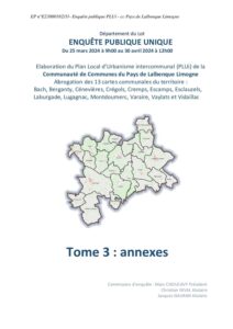 Dans le tome 3, il est fourni les documents réglementaires fondamentaux ainsi que le procès-verbal de synthèse de la commission d’enquête et le mémoire en réponse du responsable du projet