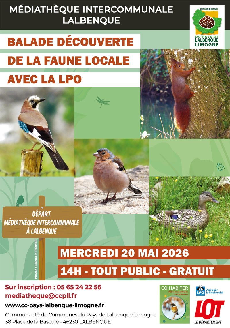 Au départ de la Médiathèque Intercommunale de Lalbenque, venez participer à une balade découverte de la faune locale, en compagnie de la LPO ! Dans le cadre des animations "Co-habiter".