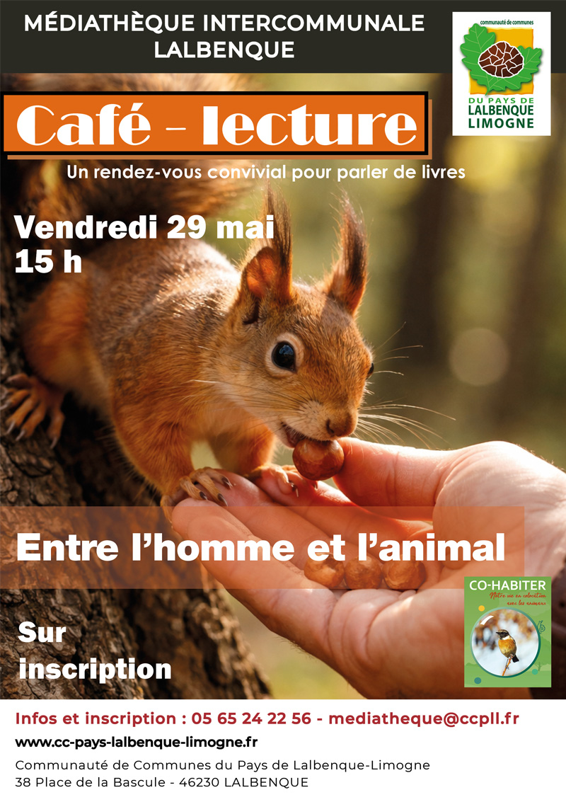 Vendredi 29 mai 2026, à 15h : venez participer à la médiathèque intercommunale de Lalbenque, au café-lecture "Entre l'homme et l'animal" ! Sur inscription.