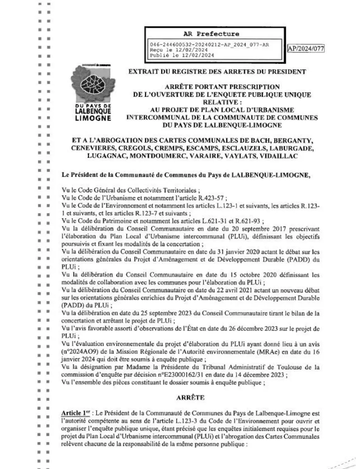URBANISME Arrêté_AP2024077_Ouverture enquête publique unique PLUi et abrogation cartes communales_CCPLL 2024 Français pdf 363 Ko Feuilleter Consulter Télécharger
