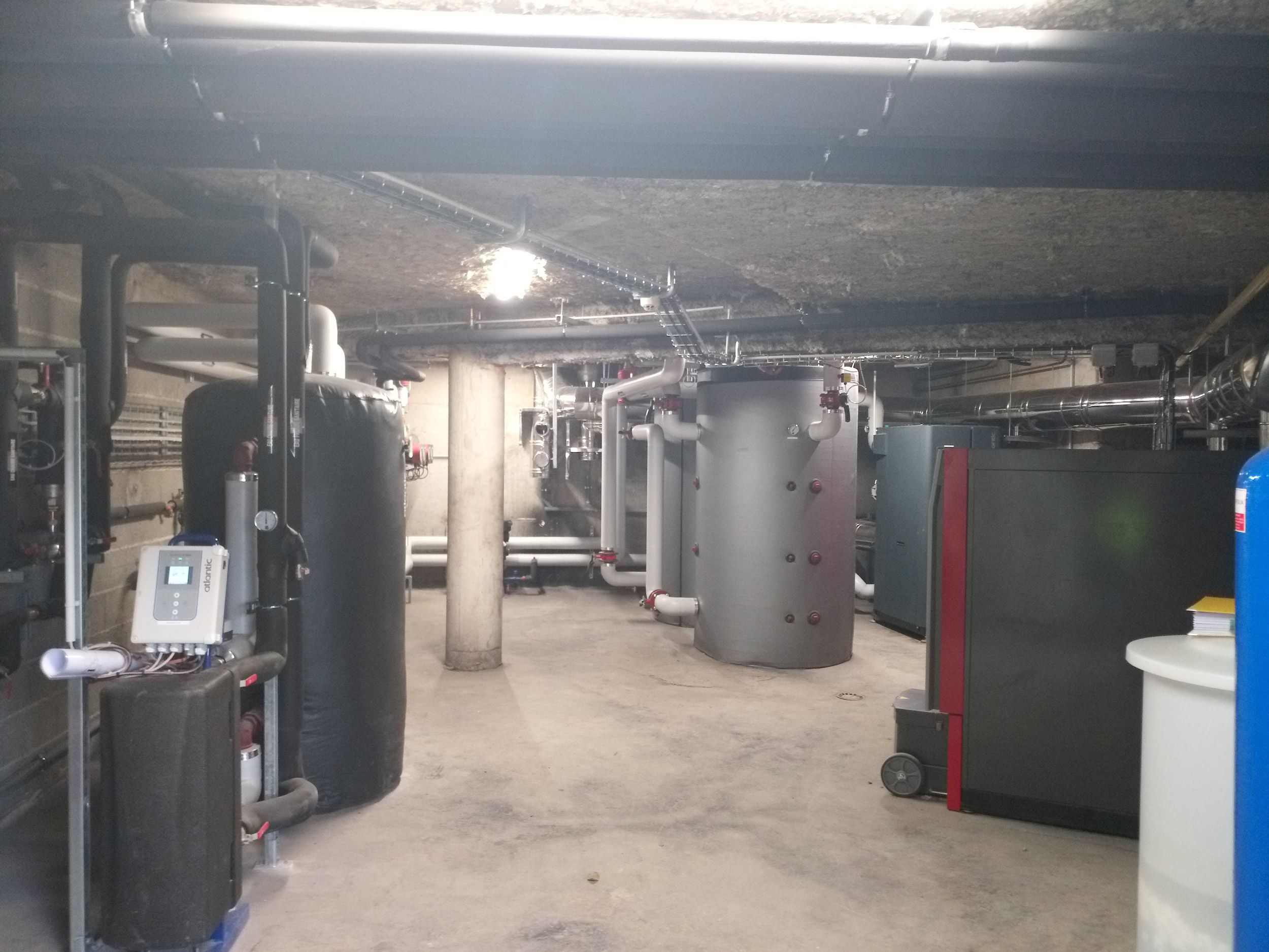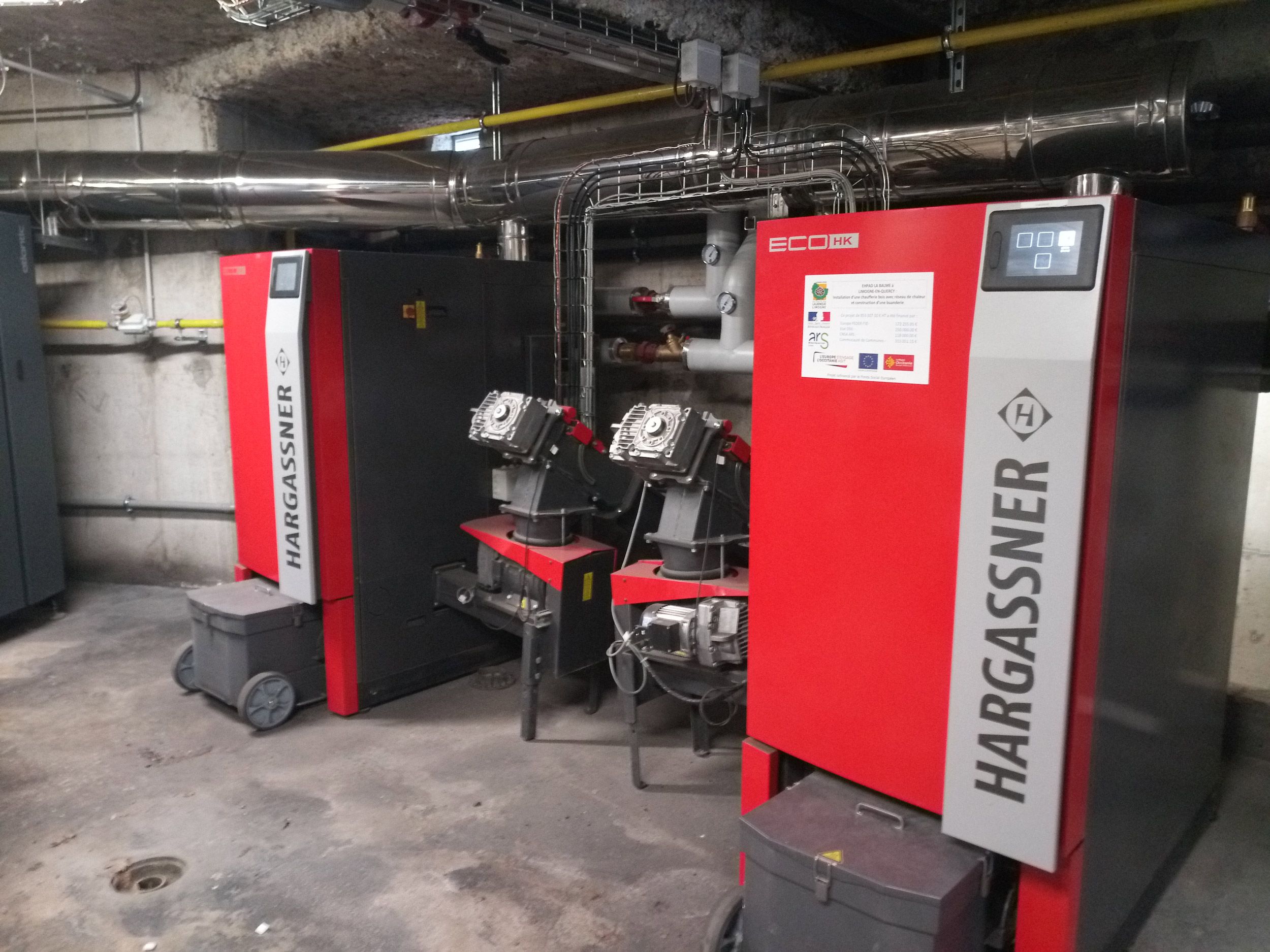 L’ancienne chaudière bois a été remplacée par deux plus petites. Elles peuvent se relayer ou s’associer en fonction des besoins en chauffage et eau chaude sanitaire. La nouvelle chaufferie est toujours alimentée en plaquettes de bois déchiqueté produites localement à la menuiserie POULET de Martiel (12200).